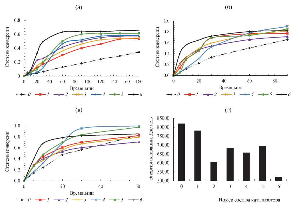 Рис. 8. Каталитическая активность материалов (степень конверсии) при 300 (а), 350 (б), 400°С (в) и энергия активации процесса (г) (номера кривых соответствуют номерам образцов в табл. 2).