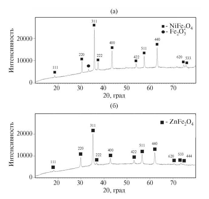 Рис. 1. Дифрактограммы образцов NiFe2O4 (а) и ZnFe2O4 (б), синтезированных цитратным методом (карточки JCPDS № 54-0964 и № 82-1042.)
