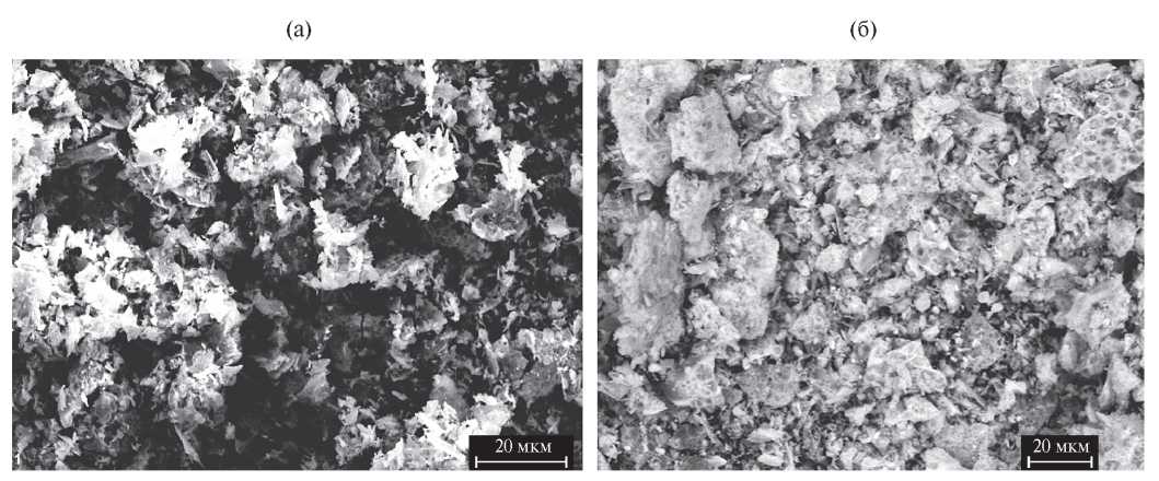 Рис. 2. РЭМ-изображения образцов NiFe2O4 (а) и ZnFe2O4 (б).