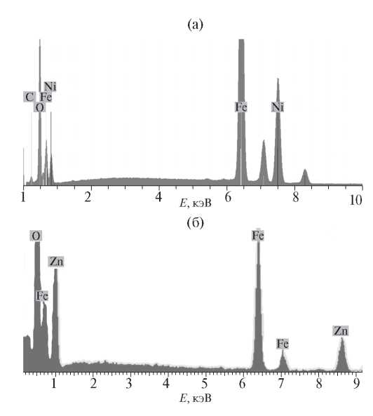 Методом энергодисперсионного анализа в синтезированных порошках ферритов никеля и цинка подтверждено присутствие элементов Ni, Fe, O и Zn, Fe, O соответственно в атомном соотношении приблизительно 1 : 2 : 4 (рис. 3).