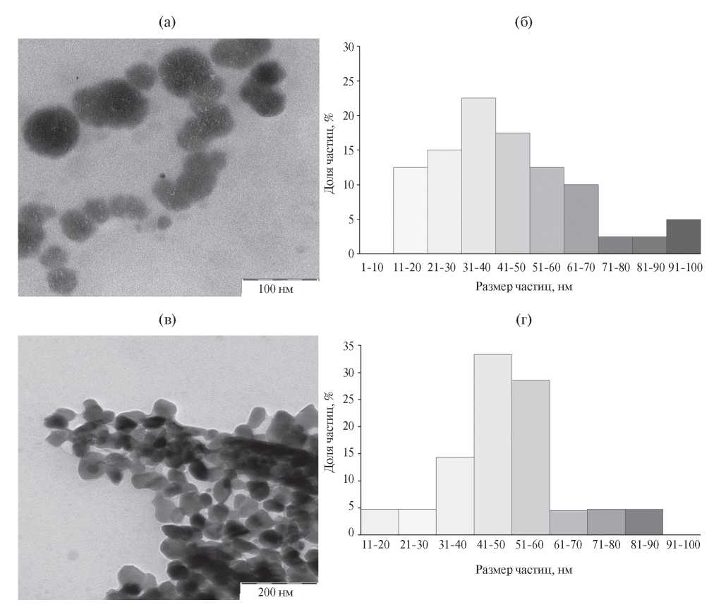 Рис. 4. ПЭМ-изображения (а, в) и гистограммы распределения частиц по размерам (б, г) образцов NiFe2O4 и ZnFe2O4 соответственно.