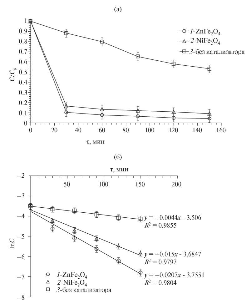 Рис. 5. Кинетические кривые окислительной деструкции МС в координатах C/C0–τ(а) и lnC–τ (б): 1 – в присутствии ZnFe2O4, 2 – в присутствии NiFe2O4, 3 – без катализатора.