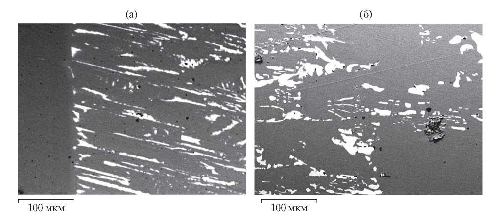 Рис. 1. СЭМ-изображения (Z-контраст) периферийных участков монокристаллов (La0.86Tb0.14)3Ga5SiO14 с включениями примесных фаз (светлые участки).