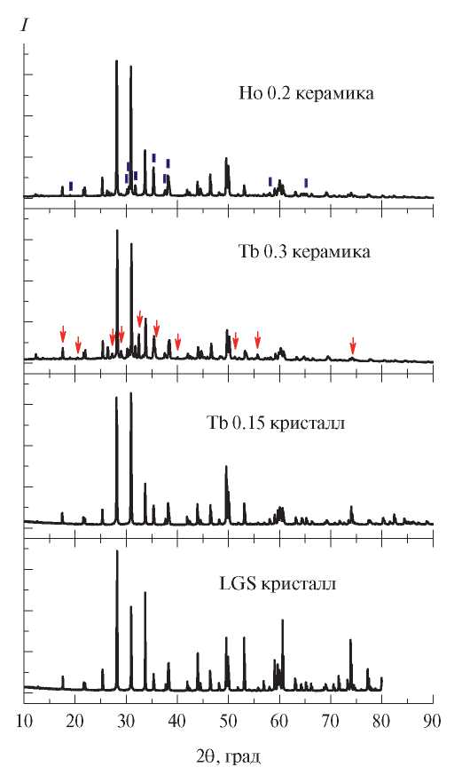 На рис. 2 приведены выборочно рентгенограммы образцов разного состава. При небольших концентрациях х – в образцах (La1−xRx)3Ga5SiO14 до x = 0.1 (R = Ho) и до x = 0.15 (для R = Tb) – основная кристаллическая фаза имеет структуру лангасита. С увеличением концентрации замещающих ионов увеличивается доля примесных фаз. Основной из них является фаза со структурой граната, что показано на примере образца Tb-замещенного лангасита, полученного твердофазным синтезом из шихты с x = 0.3 (соответствующие рефлексы отмечены красными стрелками). Уточненный параметр кубической решетки гранатной фазы а = 12.3442(1) Å близок к параметру решетки граната Tb3Ga5O12 а = 12.3474Å (PDF Card 88-575). При дальнейшем росте x до 0.4 количество фазы граната возрастает. Аналогичная картина – образование фазы со структурой граната – наблюдается и в Но-замещенных лангаситах. Исключение составил лишь образец керамики, полученный из шихты с x = 0.2, в котором в качестве примесной фазы присутствует оксид галлия (рефлексы отмечены на рис. 2 прямоугольниками). Следует отметить, что в неоднофазных образцах помимо фазы граната присутствуют в незначительных количествах и другие соединения. На рентгенограммах они проявляются несколькими слабыми рефлексами, и идентифицировать их не удалось.