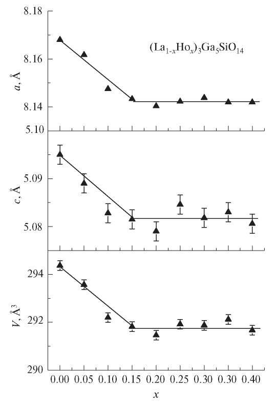 Рис. 4. Параметры решетки образцов керамики (La1−xHox)3Ga5SiO14.