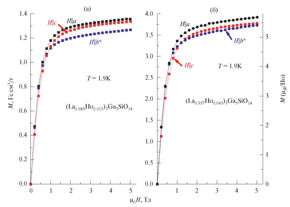 Магнитные и диэлектрические свойства (La1−xRx)3Ga5SiO14 (R = Ho, Tb). Проведенные на выращенных монокристаллах магнитные измерения обнаружили сильную магнитокристаллическую анизотропию при низких температурах и, кроме того, послужили хорошим дополнительным критерием для определения истинной концентрации x* замещающего лантан тяжелого РЗЭ. В качестве примеров, иллюстрирующих одинаковое магнитное поведение кристаллов (La1−xRx)3Ga5SiO14 (R = Ho, Tb), взятых из средней части були, на рис 5а и 5б приведены кривые намагничивания для R = Ho в единицах Гс см3/г и в магнетонах Бора (μB) на ион Ho3+ [9, 21].