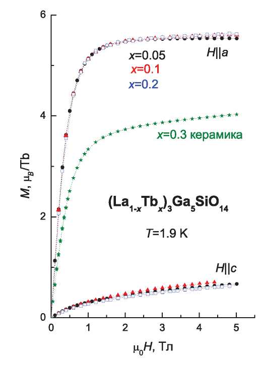 В случае замещения тербием величины намагниченности при низких температурах для кристаллов с номинальными концентрациями х = 0.2, 0.1 и 0.05 соотносятся приблизительно как 3 : 2 : 1. Принимая концентрацию х = 0.05 за истинную х*, для состава с х = 0.1 истинная концентрация х* = 0.1 оказывается несколько больше, чем приведенная в табл. 1 х* = 0.076 (впрочем, на другом кристалле результат ЭДРС – х* = 0.087, что ближе к значению х* = 0.1 по магнитным измерениям). Для образца с х = 0.2 получено практически полное согласие магнитных данных и ЭДРС. На рис. 6 приведены кривые намагничивания допированных тербием лангаситов вдоль кристаллографических осей а и с при Т = 1.9 К, а также кривая намагничивания керамического образца с х = 0.3 в единицах μB/Tb. Видно, что кривые намагничивания вдоль соответствующих направлений для всех трех составов совпадают, а кривая намагничивания керамики примерно соответствует усредненной по всем направлениям намагниченности монокристалла. В теоретическом моделировании для всех составов использовано единое значение магнитного момента иона Tb3+ 8.25 μB для основного квазидублета в кристаллическом поле.