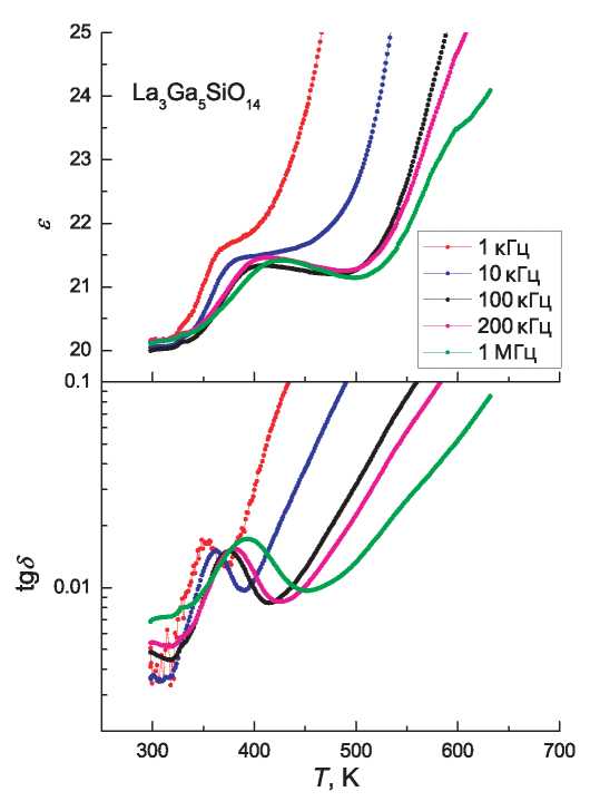 Рис. 7. Температурно-частотные зависимости ε и tgδ керамического образца La3Ga5SiO14.