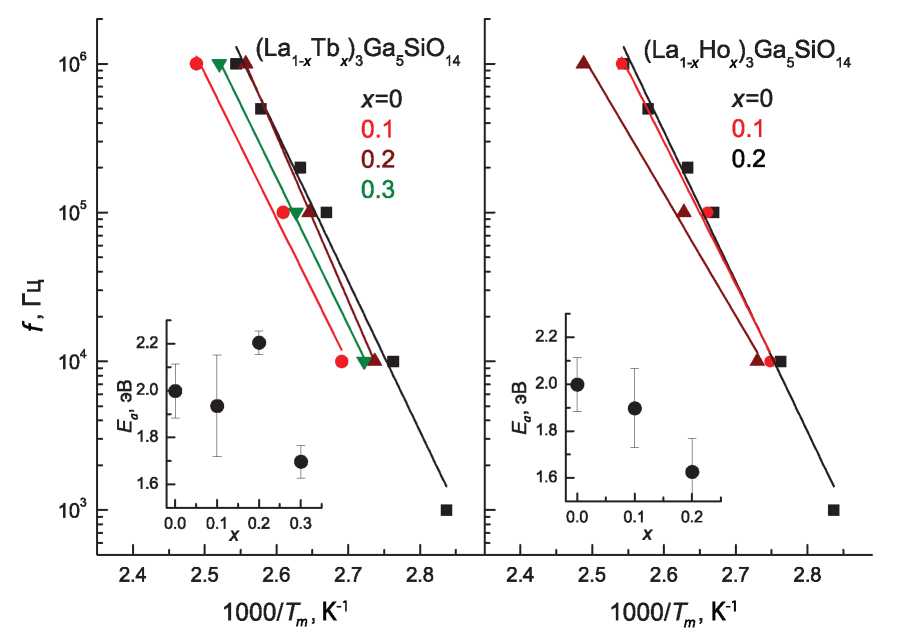 Рис. 8. Зависимости частоты релаксации от обратной температуры для керамических образцов (La1−x(Ho, Tb)x)3Ga5SiO14: точки соответствуют максимумам на tgδ (Τ) (рис. 7), прямые линии – результаты аппроксимации наблюдаемой релаксации по формуле Аррениуса; на вставках концентрационные зависимости энергии активации.