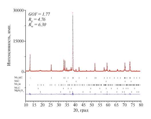 Тройная фаза Nb2AlC относится к семейству MAX-фаз – соединений переходных металлов с алюминием и углеродом Mn+1AlСn (M – переходный металл) [1]. Эти фазы имеют слоистую кристаллическую структуру с гексагональной плотной упаковкой P63/mmc, в которой карбидные блоки [Мn+1Cn] разделены монослоями атомов Al. Интерес к подобным соединениям обусловлен их физико-химическими свойствами, сочетающими достоинства керамики и металлов, что делает их перспективными материалами для использования в условиях высоких температур и окислительных сред [2–4]. Наряду с высокой электро- и теплопроводностью Nb2AlC обладает термостойкостью и стойкостью к окислению до 700 [5, 6]. Nb2AlC также характеризуется стабильностью микроструктуры при нагреве: длительный отжиг при 1600°C не приводит к заметному росту зерна, что свидельстует о высоком сопротивлении ползучести материала [7].