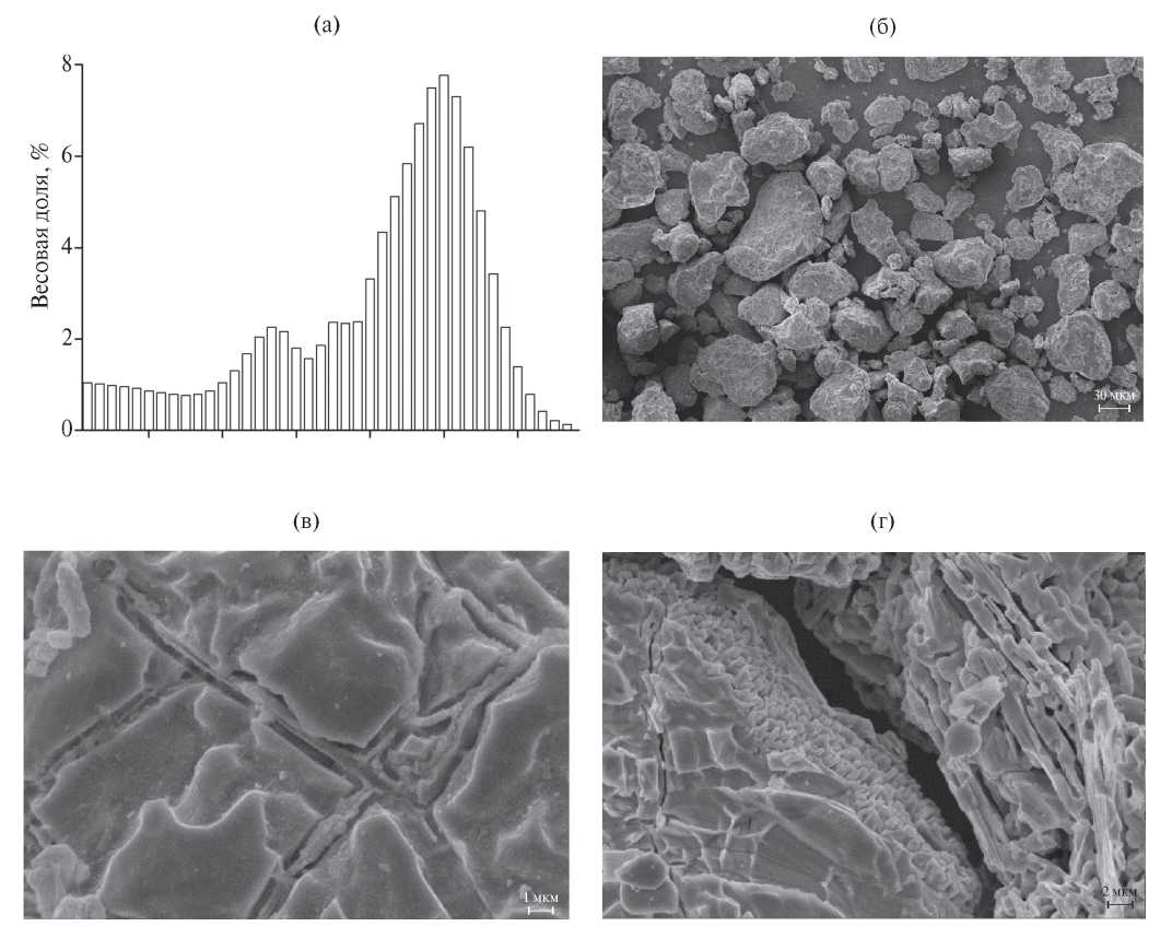 Распределение частиц порошка по размерам показывает, что средний размер частиц составляет 35 мкм (рис. 4а). Морфология частиц Nb2AlC характеризуется типичной для МАХ-фазы пластинчатой формой (рис. 4б–4г) с толщиной пластинок 100–500 нм.