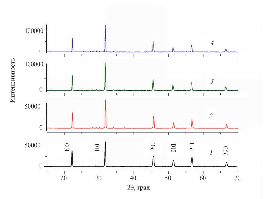 Рис. 1. Дифрактограммы образцов (1-x)(K0.5Na0.5)NbO3–xSrZrO3, модифицированных ZnO, с x = 0.05 (1), 0.075 (2), 0.125 (3), 0.15 (4).