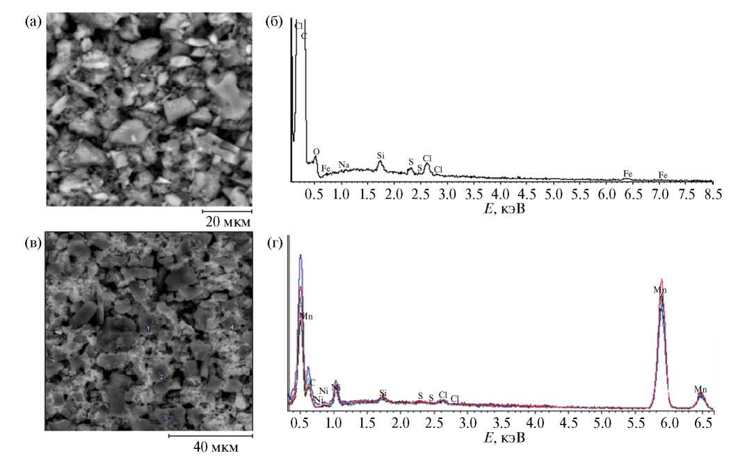 Для изучения поверхностного химического состава и однородности распределения соответствующих элементов проводили СЭМ-EDX-исследование в разных точках поверхности (рис. 1). Спектры EDX показывают присутствие элемента Mn в случае композитного электрода (рис. 1г). При осаждении оксида марганца на угольный электрод меняется и морфология поверхности. На СЭМ-микрофотографии наблюдаются фазы и участки, имеющие более светлые оттенки (рис. 1в).