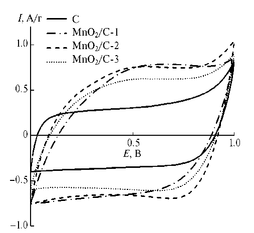 Циклические вольтамперограммы снимали в 0.5 М водных растворах сульфатов лития, натрия и калия. Модифицированные угольные электроды, исследованные в 0.5 М растворах Li2SO4, Na2SO4 и K2SO4, обозначили как MnO2/С-1, MnO2/С-2, MnO2/С-3 соответственно.