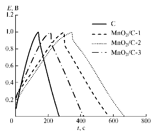 Гальваностатические заряд-разрядные кривые, полученные на С и MnO2/С, симметричны при высоких токах заряда-разряда, что указывает на идеальное емкостное поведение (рис. 4).