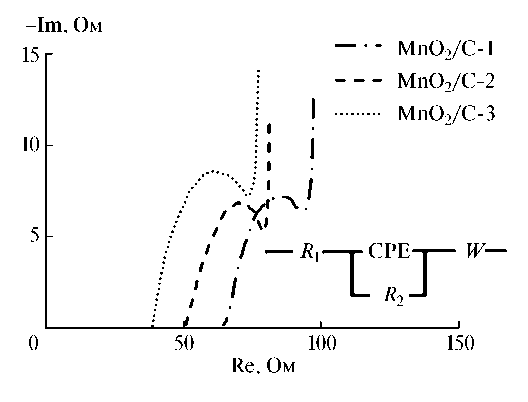 Сопротивление переноса заряда R2 является наименьшим в электролите Na2SO4 и составляет 2.8 Ом. Значения R2 для электродов MnO2/С-1 и MnO2/С-3 равны 8.0 и 6.5 Ом соответственно.