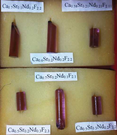 Рис. 1. Фотография монокристаллов твердого раствора Ca1-x-ySrxNdyF2+y.
