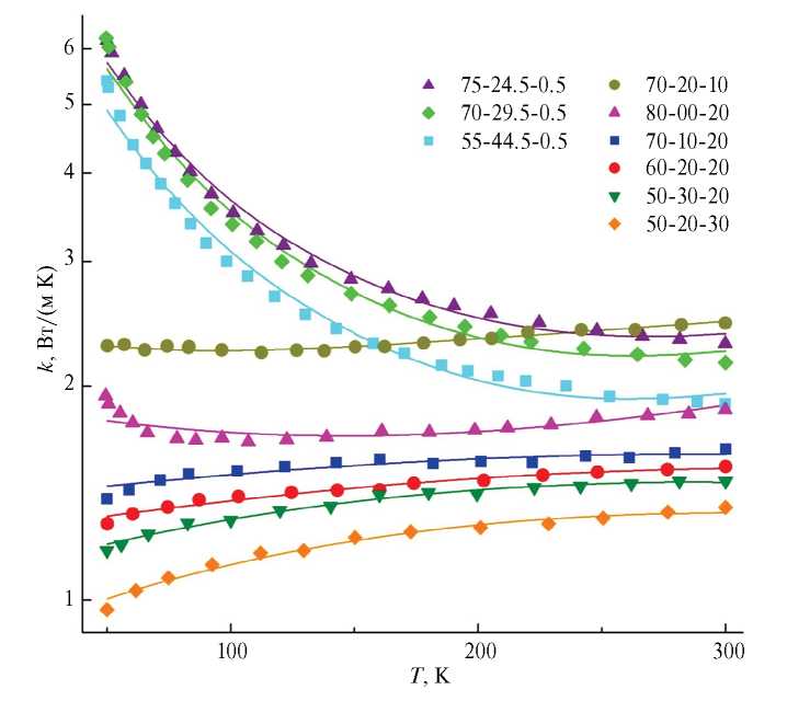 Результаты измерений теплопроводности представлены в виде графиков ее температурной зависимости k(T) на рис. 4 (содержание компонент в мол. %, маркерами обозначены экспериментльные точки k(T), сплошные линии представляют собой результат аппроксимации с применением приведенной далее формулы (1). Численные значения теплопроводности для нескольких температур приведены в табл. 1.