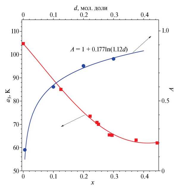 Можно отметить четкую корреляцию значений параметра А и содержания трехвалентных ионов неодима (рис. 6), что отражает увеличение “аморфного вклада” в тепловое сопротивление исследованных кристаллов. Как и в случае двойных твердых растворов Ca1-xYbxF2+x и Ca1-xYxF2+x [42, 43], для составов Ca1-x-ySrxNdyF2+y зависимость A(y) можно аппроксимировать логарифмическим выражением с постоянной составляющей (параметр d в выражении (2) равен значению y в составе Ca1-x-ySrxNdyF2).