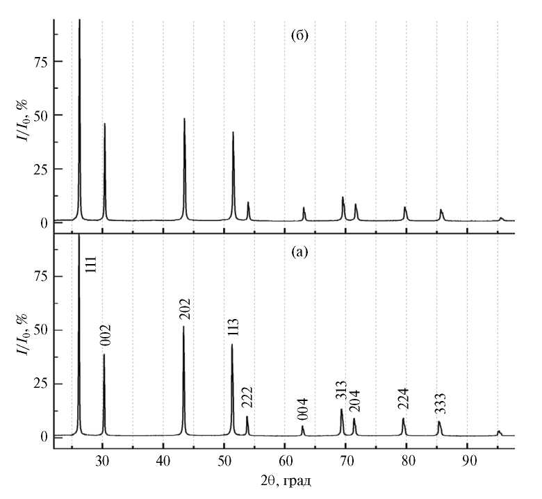 Рис. 2. Дифрактограммы твердого раствора Pb1−xScxF2+x: образцы из нижней (а) и верхней (б) частей кристаллической були.