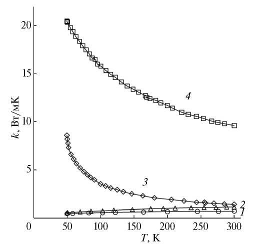 Измерения теплопроводности в температурном интервале 50−300 K проводились абсолютным стационарным методом продольного теплового потока. Детальное описание методики измерений и экспериментальная аппаратура приведены в [17]. Погрешность определения коэффициента теплопроводности была в пределах ± 5%.