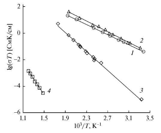 Рис. 4. Температурные зависимости ионной проводимости кристаллов: 1 − Pb0.91Sc0.09F2.09, эксперимент, 2 − Pb0.67Cd0.33F2 [9], 3 − β-PbF2 [17] и 4 − ScF3 [19].
