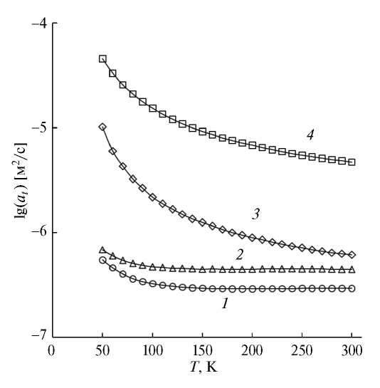Рис. 5. Температурные зависимости температуропроводности кристаллов: 1 − Pb0.91Sc0.09F2.09, 2 − Pb0.67Cd0.33F2, 3 − β-PbF2 и 4 − ScF3.