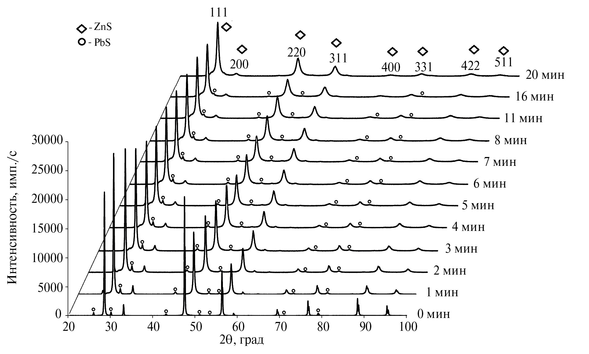 Для получения ультрадисперсных порошков образцы подвергали механоактивации в режиме сухого помола в высокоэнергетической планетарной мельнице Fritsch Pulverizette 7 с гарнитурой из карбида вольфрама (объем чаши – 80 мл, количество шаров диаметром 10 мм – 30 шт (236 г), объем загружаемого материала – 20 мл, что соответствовало 32.2 г измельченного сфалерита), скорость вращения размольных стаканов – 800 об./мин. С целью исключения локального перегрева размол образцов вели поэтапно, с периодичностью этапов от 1 до 5 мин, на воздухе. Суммарная продолжительность помола для сфалерита составила 20 мин. После каждого этапа образцы подвергали рентгенофазовому анализу (РФА) на дифрактометре Shimadzu XRD-7000, CuKα1-излучение, диапазон углов по 2θ 20°–100°, выдержка 2 с.