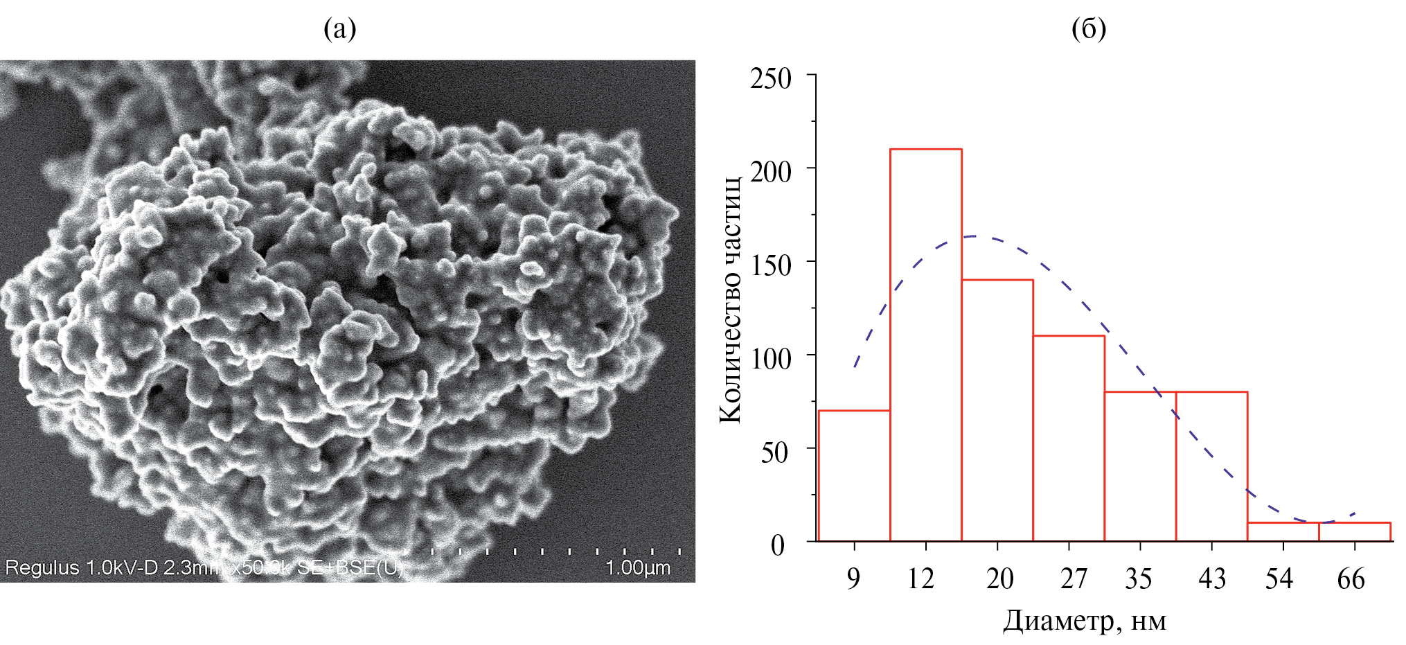 Рис. 1. СЭМ-снимок НЧ карбида титана (а) и распределение частиц по размерам (б).