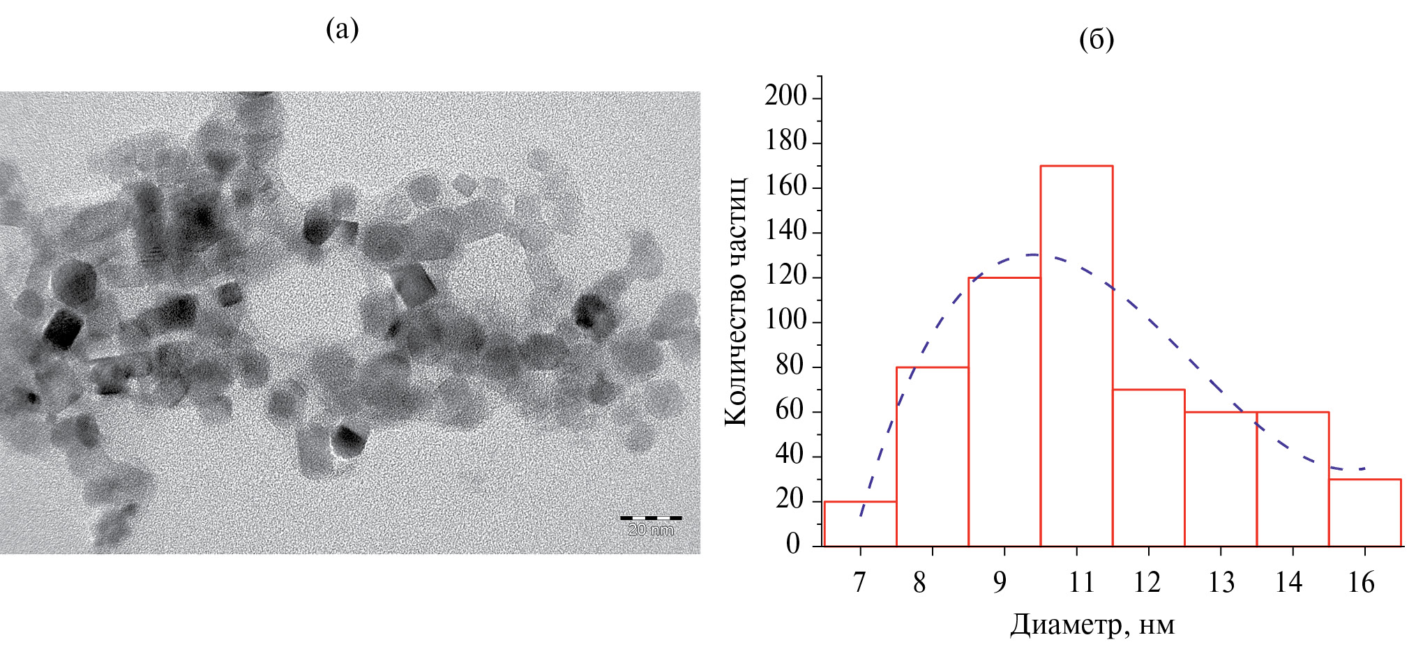 Рис. 2. ПЭМ-снимок НЧ карбида титана (а) и распределение частиц по размерам (б).