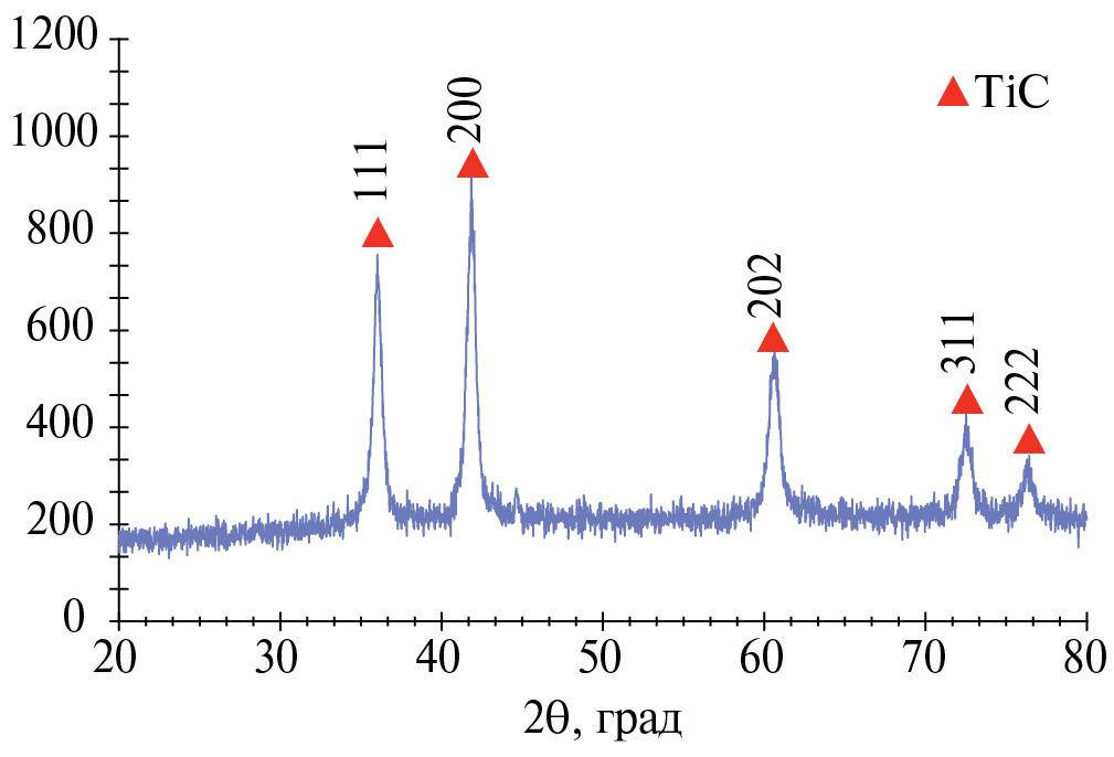 На рис. 3 показана рентгенограмма полученных НЧ карбида титана, синтезированных методом ИПЛ. Наблюдаются пять характерных пиков (111, 200, 202, 311 и 222) при 2θ = 36.06°, 41.84°, 60.64°, 72.52° и 76.38° соответственно. Эти пики отвечают кубической сингонии (структурный тип Fmm) и согласуются с базой данных COD № 9008747. Размер кристаллитов, рассчитанный на основании уравнения Шеррера по наиболее интенсивному пику, составил 15 нм.