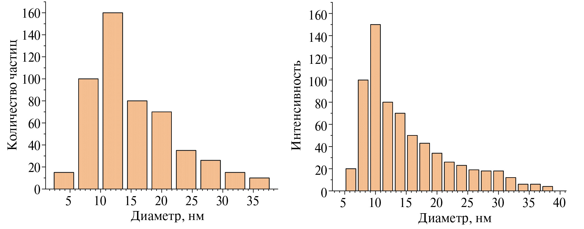 Распределение НЧ по размерам было найдено методом ДРС на приборе NANO-flex II (Microtrac Inc., США), который анализирует частицы в диапазоне от 0.3 нм до 10 мкм. В качестве жидкой фазы использовался н-гексан с ζ-потенциалом 40–46 мВ, определенным на приборе NANO-flex Stabino (Microtrac Inc., США). Концентрация суспензий составляла 1000 ppm, диспергирование ультразвуком проводилось в течение 20 мин.