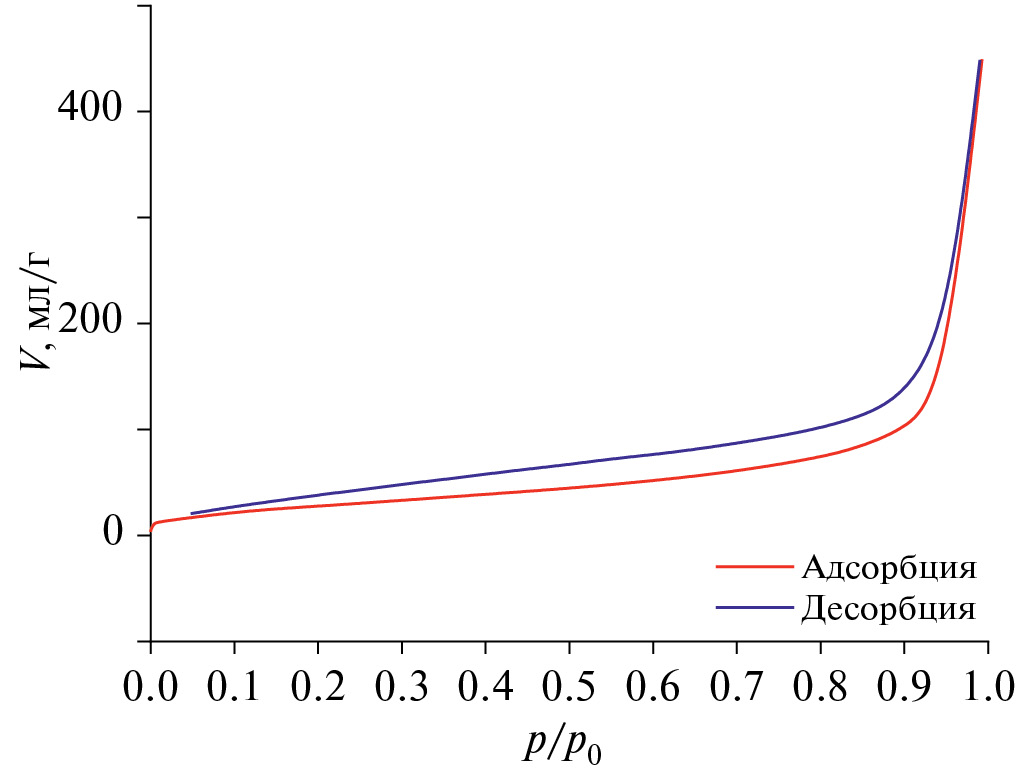 На рис. 5 показаны изотермы адсорбции/десорбции, полученные для НЧ карбида титана. Кривая относится к изотерме смешанного типа 2 и 3, присущей макропористым адсорбентам. Этот тип изотермы характеризует собой свободную монослойную адсорбцию. Незначительная точка перегиба в области относительного давления 0.15 определяется повышенным взаимодействием адсорбат–адсорбат по сравнению с взаимодействием адсорбат–адсорбент. Полученный гистерезис между изотермами адсорбции и десорбции указывает на наличие мезопор. Этот тип гистерезиса относится к типу А и характерен для пор цилиндрической формы.