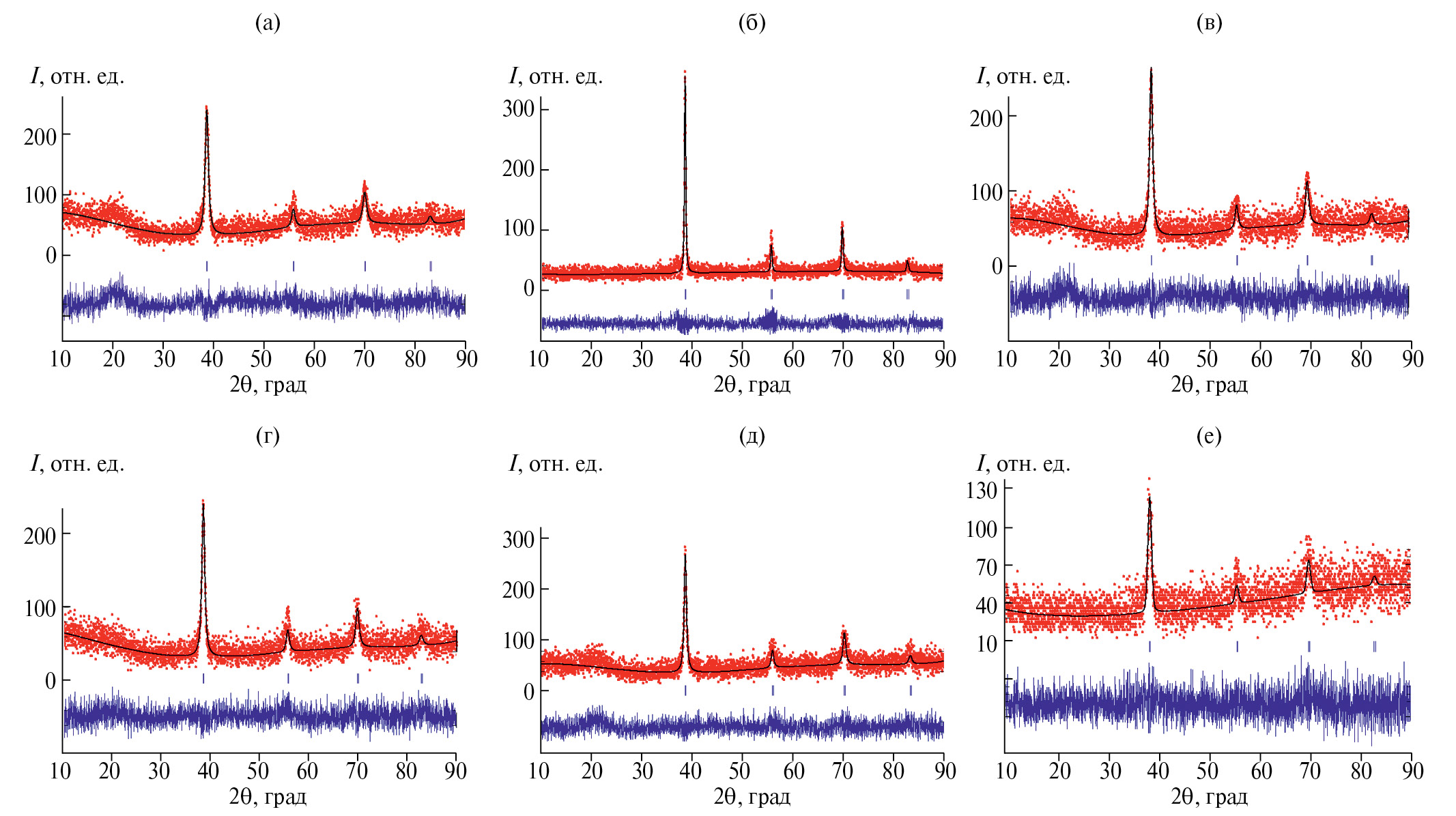 Рис. 1. Рентгенограммы образцов ВЭС: а – TiZrNbTaMo, б – TiZrNbTa(Mo0.8V0.2), в – TiZrNbTa(Mo0.6V0.4), г – TiZrNbTa(Mo0.4V0.6), д – TiZrNbTa(Mo0.2V0.8), е – TiZrNbTaV, обработанные по методу Ритвельда (показаны экспериментальный (точки) и расчетный (верхняя линия) профили, разность между ними (нижняя линия), штрихи соответствуют брэгговским позициям).
