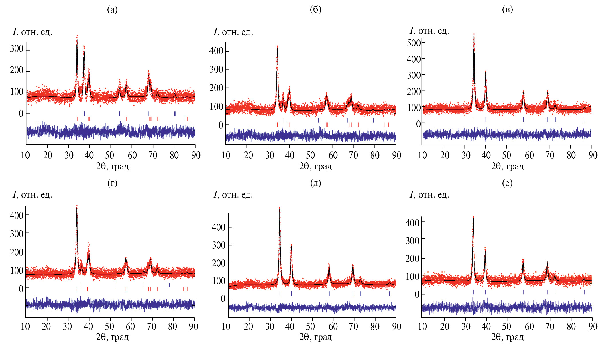 Рис. 2. Рентгенограммы гидридных фаз на основе ВЭС: а – TiZrNbTaMo (1.8 Н/М), б – TiZrNbTa(Mo0.8V0.2) (2.2 Н/М), в – TiZrNbTa(Mo0.6V0.4) (2.4 Н/М), г – TiZrNbTa(Mo0.4V0.6) (2.7 Н/М), д – TiZrNbTa(Mo0.2V0.8) (2.8 Н/М), е – TiZrNbTaV (2.9 Н/М), обработанные по методу Ритвельда (показаны экспериментальный (точки) и расчетный (верхняя линия) профили, разность между ними (нижняя линия), штрихи соответствуют брэгговским позициям).