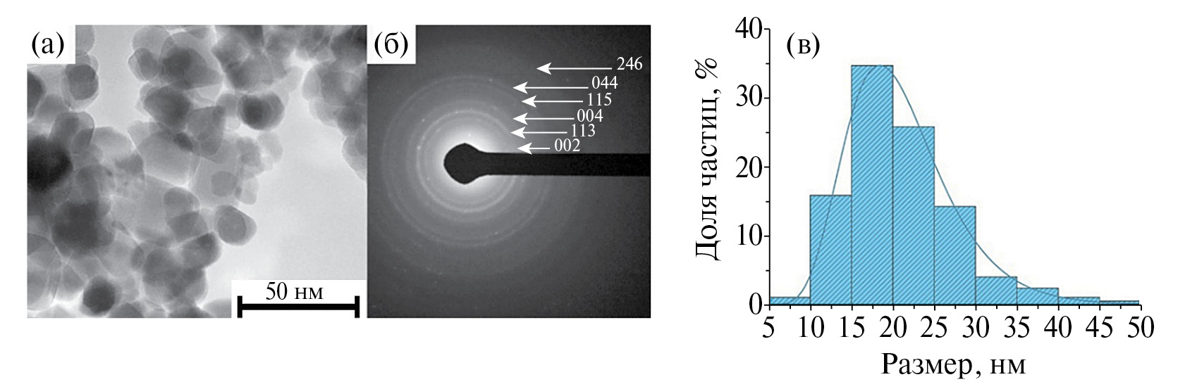 Рис. 1. ПЭМ-изображение (а), электронная микродифракция (б), а также диаграммы распределения НЧ CuFe2O4 по размерам (в).