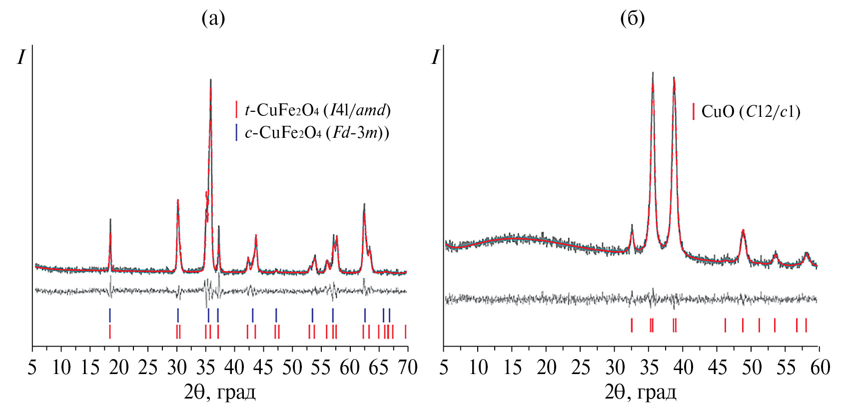 Рис. 2. Рентгенограммы НЧ CuFe2O4 (a) и CuO (б) (черные линии), результаты уточнения профиля по методу Ритвельда (красные линии) и разностная кривая (светло-серые линии).