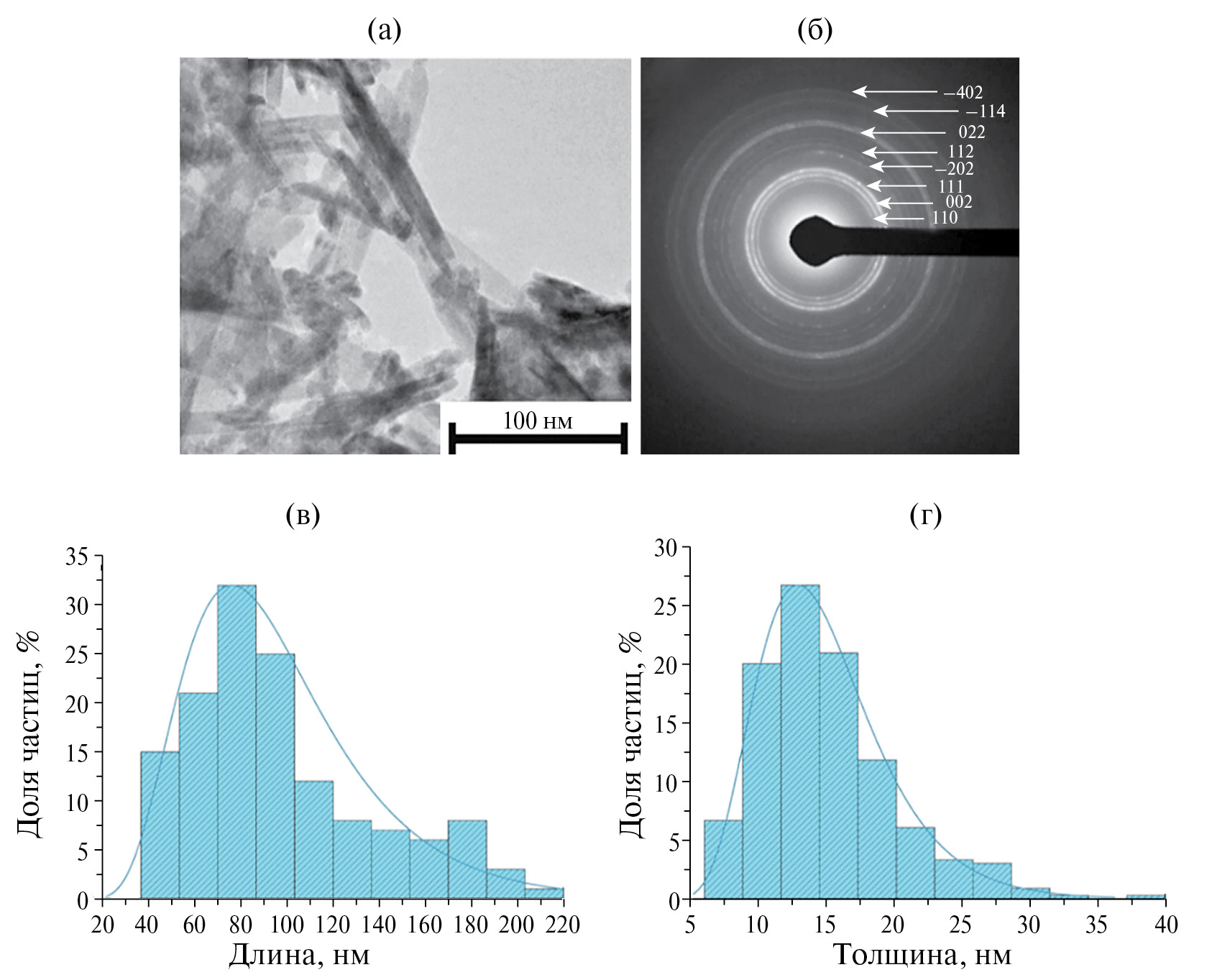 Рис. 3. ПЭМ-изображение (а), электронная микродифракция (б), а также диаграммы распределения НЧ СuO по длине (в) и по толщине (г).