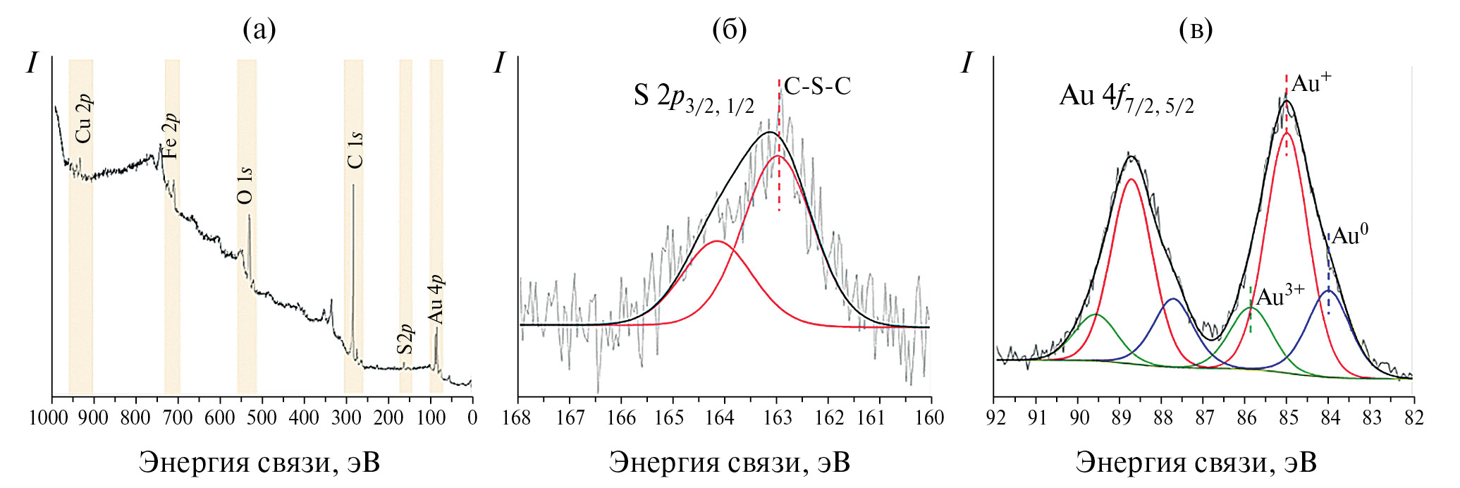 Спектр Au 4f (рис. 4в) можно разложить с использованием трех компонент: первый дублет с энергиями связи Au 4f7/2 84.0 эВ и Au 4f5/2 87.7 эВ соответствует металлическому Au (22.7%); второй дублет с энергиями связи Au 4f7/2 84.9 эВ и Au 4f5/2 88.7 эВ обусловлен наличием на поверхности Au+ (61.4%); третий дублет Au 4f7/2 85.6 эВ и Au 4f5/2 89.6 эВ может быть отнесен к Au3+ (15.0%). Наличие в спектрах ионов Au+ и Au3+ подтверждает приведенный выше механизм восстановления золота метионином.