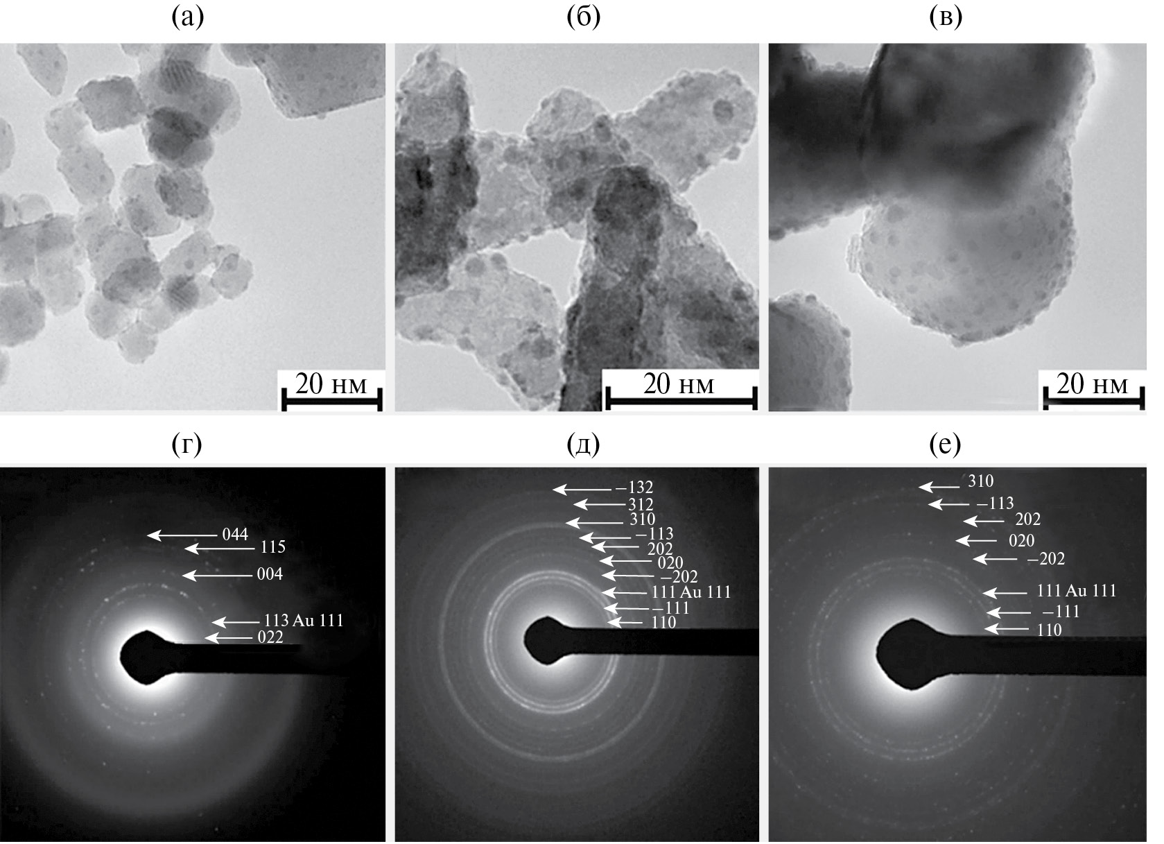 Рис. 5. ПЭМ-изображения (а, в, д) и картины микродифракции электронов (б, г, е) НЧ CuFe2O4/Au (a, б) и CuO/Au без прокаливания CuO (в, г) и после прокаливания CuO (д, е).