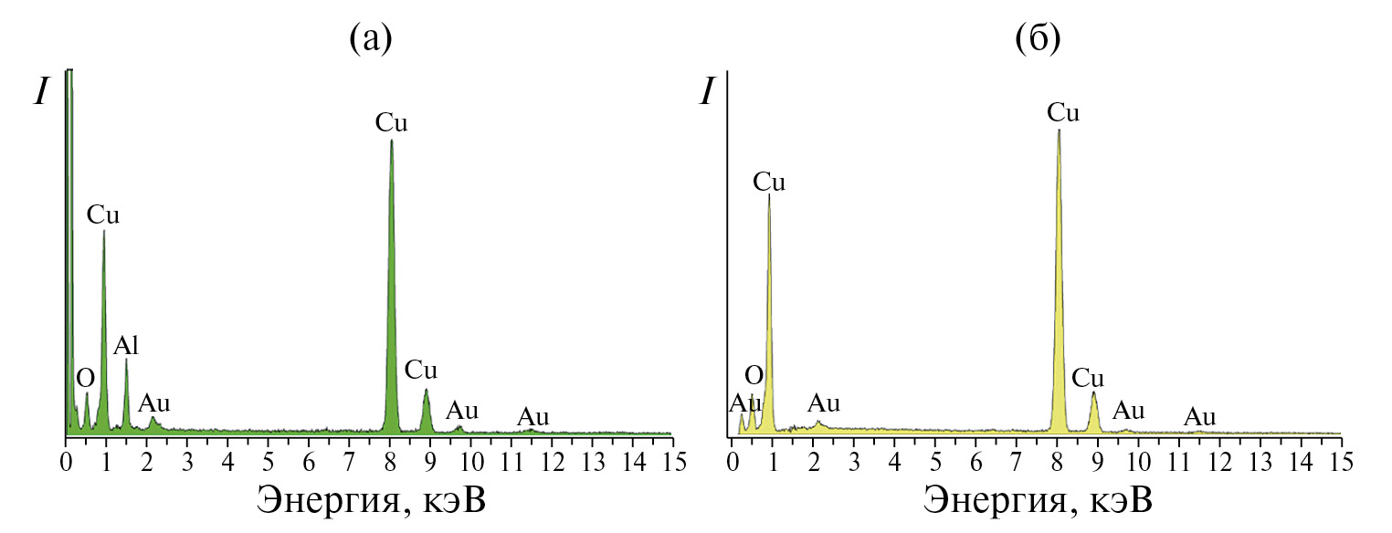 Рис. 6. ЭДРС НЧ CuO/Au без прокаливания CuO (а) и после прокаливания CuO (б).