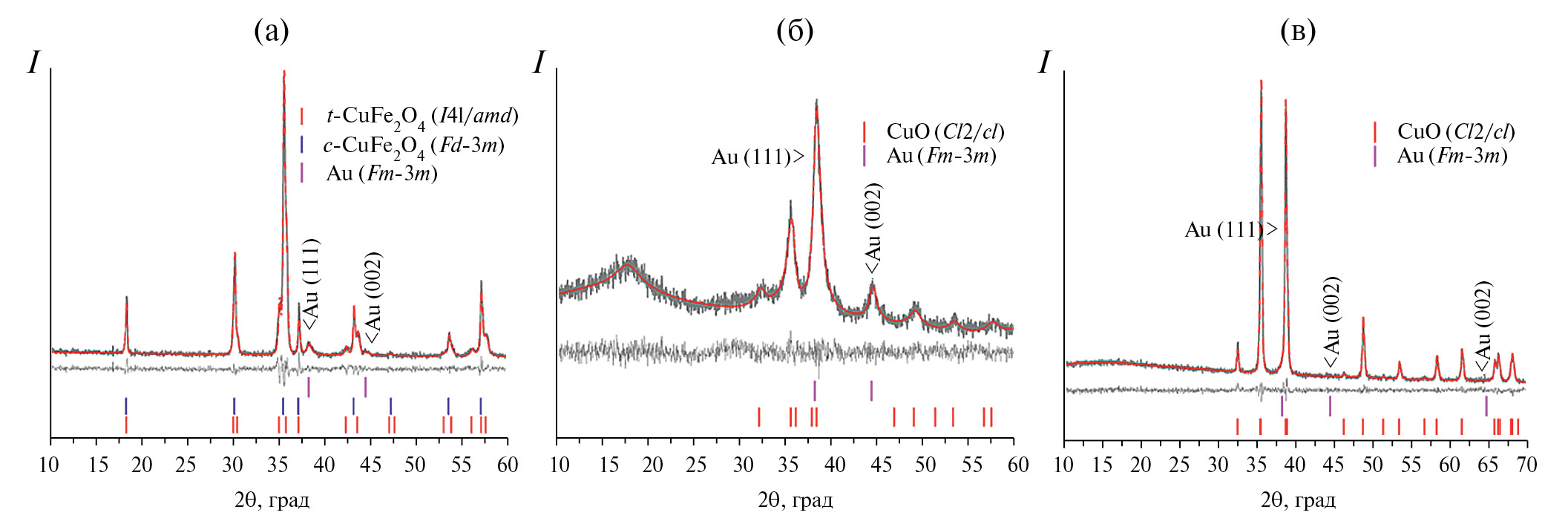 Рис. 7. Рентгенограммы CuFe2O4/Au (a) и CuO/Au без прокаливания CuO (б), после прокаливания CuO (в), а также результаты уточнения профиля по методу Ритвельда (красные линии) и разностная кривая (светло-серые линии).