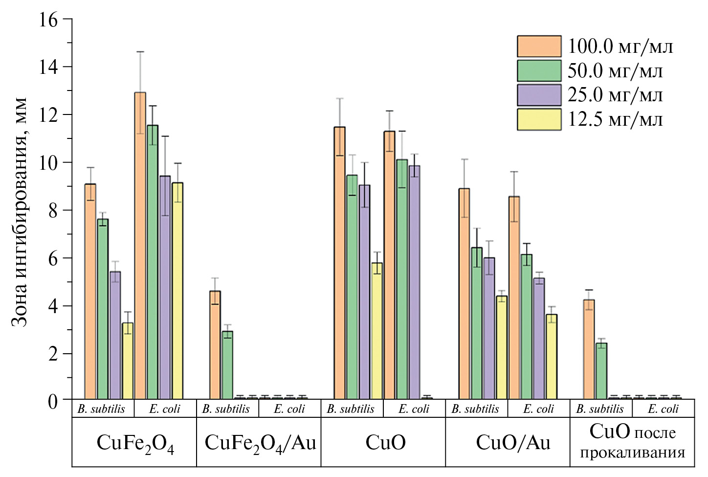 Результаты диффузионного теста (рис. 8, 9) показали, что наночастицы оксида меди (II) без золота на поверхности проявляют заметный токсический эффект (B. subtilis: 100 мг/мл – 11 ± 2 мм, 50 мг/мл – 9 ± 1 мм, 25 мг/мл – 9 ± 1 мм, 12 мг/мл – 5 ± 1 мм; E.coli: 100 мг/мл – 11 ± 1 мм, 50 мг/мл – 10 ± 1 мм, 25 мг/мл – 9 ± 1 мм), что связано с их большой площадью поверхности и высокой реакционной способностью. После термической обработки при 400°C их токсичность резко снижается: отсутствие зоны ингибирования роста E. coli во всем концентрационном диапазоне и при концентрации ниже 50 мг/мл для B. subtilis, что связано с укрупнением частиц оксида меди (II) после прокаливания, а также снижением их дзета-потенциала до 11 ± 1 мВ. Наночастицы CuFe2O4 продемонстрировали ингибирующий эффект как на E. coli, так и на B. subtilis, что позволяет потенциально использовать наночастицы CuFe2O4 в качестве магнитного антибактериального агента. Наночастицы CuFe2O4 и CuO обладают выраженным олигодинамическим действием по отношению к E. coli и B. subtilis вследствие положительного заряда поверхности НЧ (14 ± 2 мВ для CuFe2O4, 29 ± 2 мВ для СuO, 11 ± 1 мВ для СuO после прокаливания). Наночастицы адсорбируются на отрицательно заряженной поверхности бактерий, что приводит к изменению проницаемости цитоплазматической мембраны, нарушению гомеостаза, трофических и генеративных процессов [74, 75]. Снижение токсичности золотосодержащих образцов вероятно, объясняется резким снижением дзета-потенциала, вызванным адсорбцией AuCl4– и восстановлением золота на поверхности наночастиц: 0.7 ± 0.2 мВ для CuFe2O4/Au; 5 ± 1 мВ для СuO/Au; 0.5 ± 0.2 мВ СuOпрокал./Au.