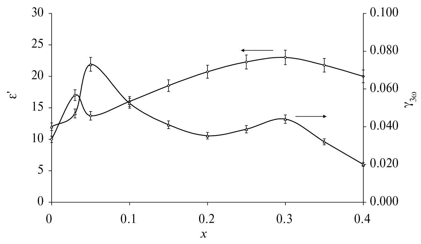 Рис. 2. Зависимости диэлектрической проницаемости εʹ и коэффициента третьей гармоники γ3ω в полярной фазе от состава (KNO3)1–x / (CeO2)x при температуре 388 К.