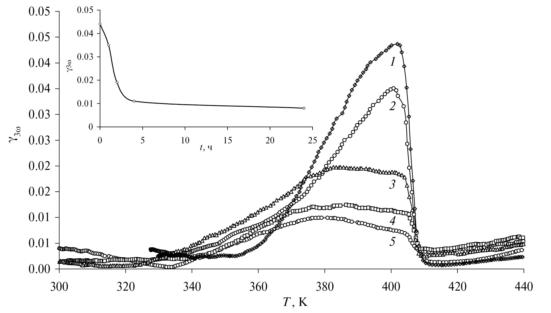 Рис. 3. Температурные зависимости коэффициента третьей гармоники γ3ω (T) для (KNO3)0.7 / (CeO2)0.3 при нагреве: 1 – сразу после охлаждения, 2 – через 1 ч, 3 – через 2 ч, 4 – через 4 ч, 5 – через 24 ч; на вставке – временная зависимость максимальных значений γ3ω.