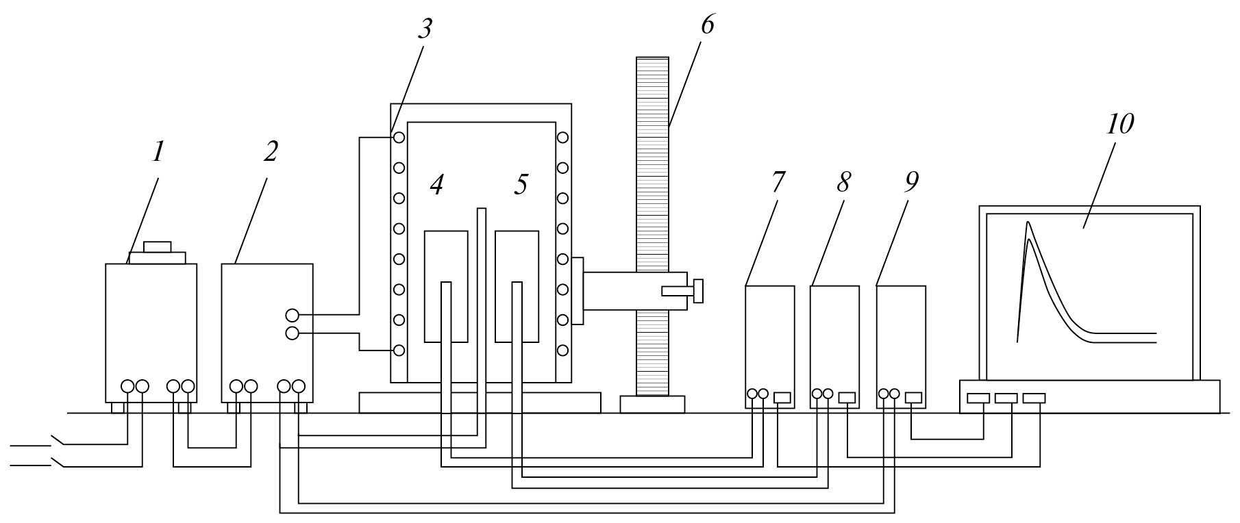 Установка состоит из следующих узлов: электропечь (3) смонтирована на стойке (6), по которой она может перемещаться вверх и вниз (стрелкой показано направление перемещения). Образец (4) и эталон (5) (тоже могут перемещаться) представляют собой цилиндр длиной 30 и диаметром 16 мм с высверленными с одного конца каналами, в которые вставлены термопары. Концы термопар подведены к цифровым многоканальным термометрам (7–9) которые подсоединены к компьютеру (10). Включается электропечь (3) через автотрансформатор (1), нужная температура устанавливается с помощью терморегулятора (2). По показаниям цифрового многоканального термометра отмечается значение начальной температуры. После нагрева образца и эталона в электропечи до нужной температуры они одновременно извлекаются из электропечи. С этого момента фиксируется снижение температуры через фиксированное время 10 с до T < 308 К.