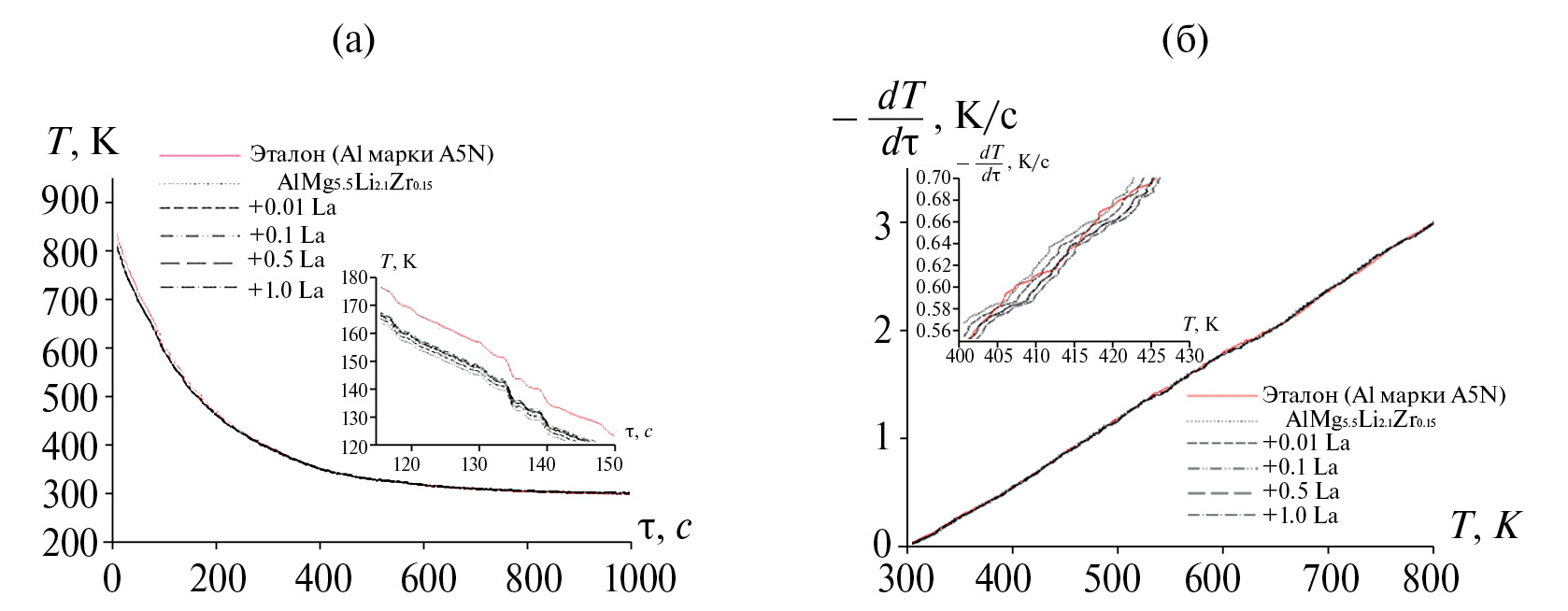 Рис. 2. Зависимости температуры от времени охлаждения (а) и скорости охлаждения от температуры (б) для сплава AlMg5.5Li2.1Zr0.15 типа дюралюминий с лантаном и эталона.