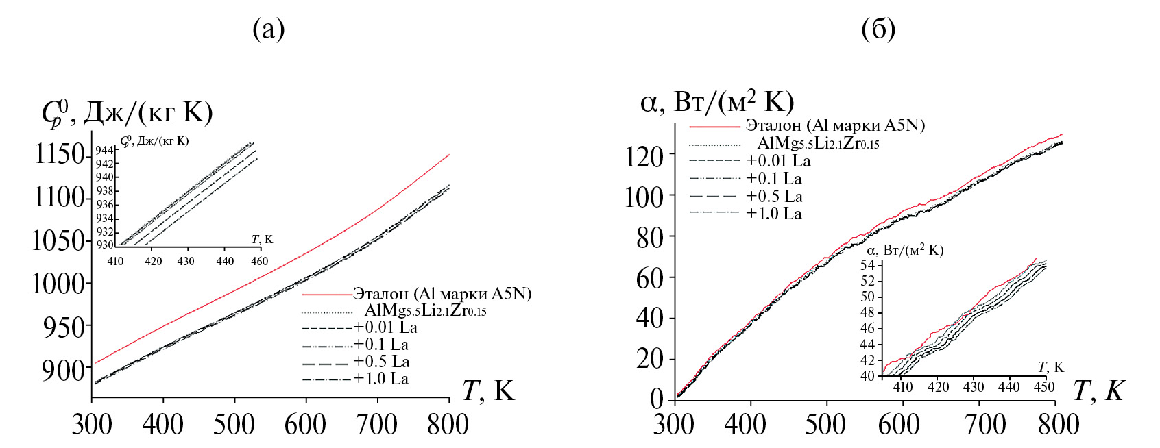 На рис. 3б приведены результаты расчета коэффициента теплоотдачи сплава AlMg5.5Li2.1Zr0.15 с лантаном в зависимости от температуры. Коэффициент теплоотдачи с ростом температуры увеличивается, а при повышении содержания лантана уменьшается.