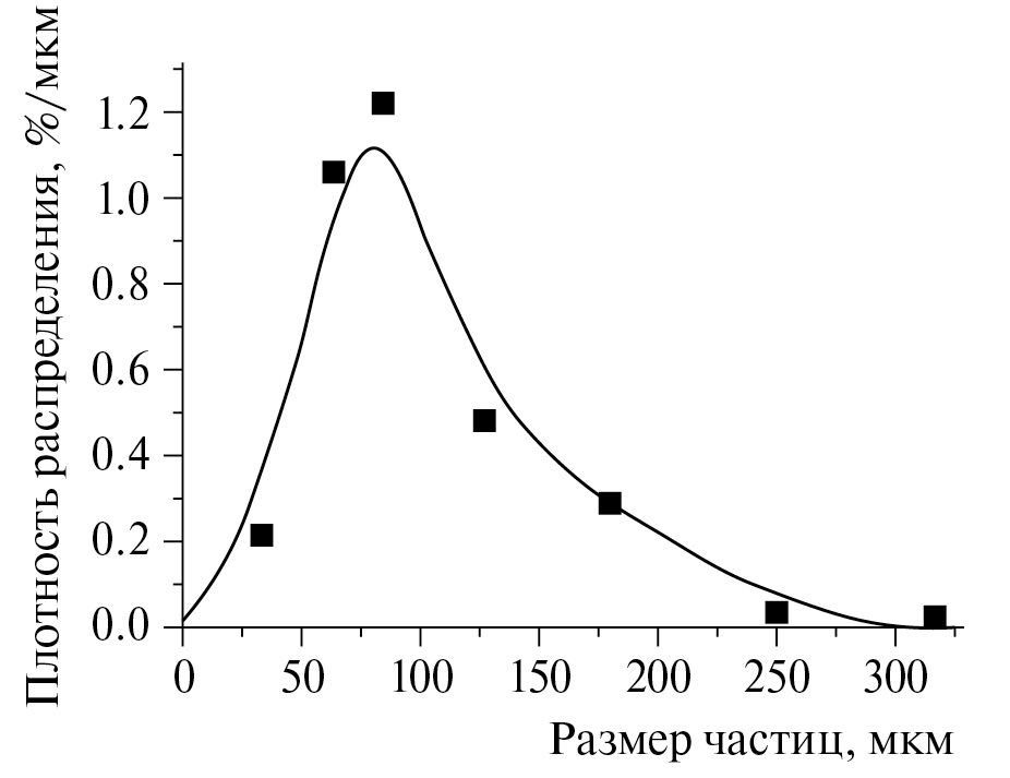 Основная масса исходной смеси (около 70%) представлена фракцией частиц размером 100–250 мкм, примерно 20% – частицы менее 70 мкм.