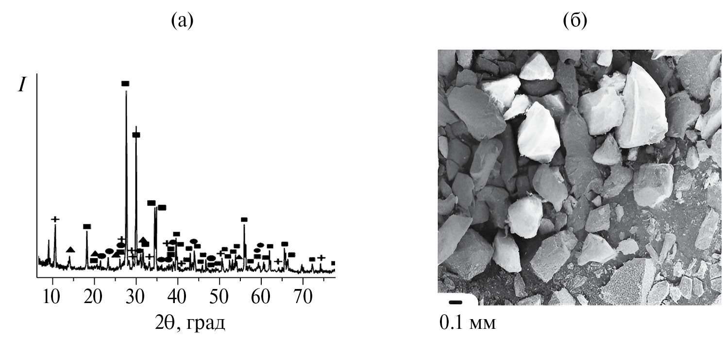 Рис. 4. Характеристика исходной минеральной смеси: а – дифрактограмма (■ – сфен, + – эгирин, ● – нефелин, ▲ – апатит); б – РЭМ-изображение частиц.